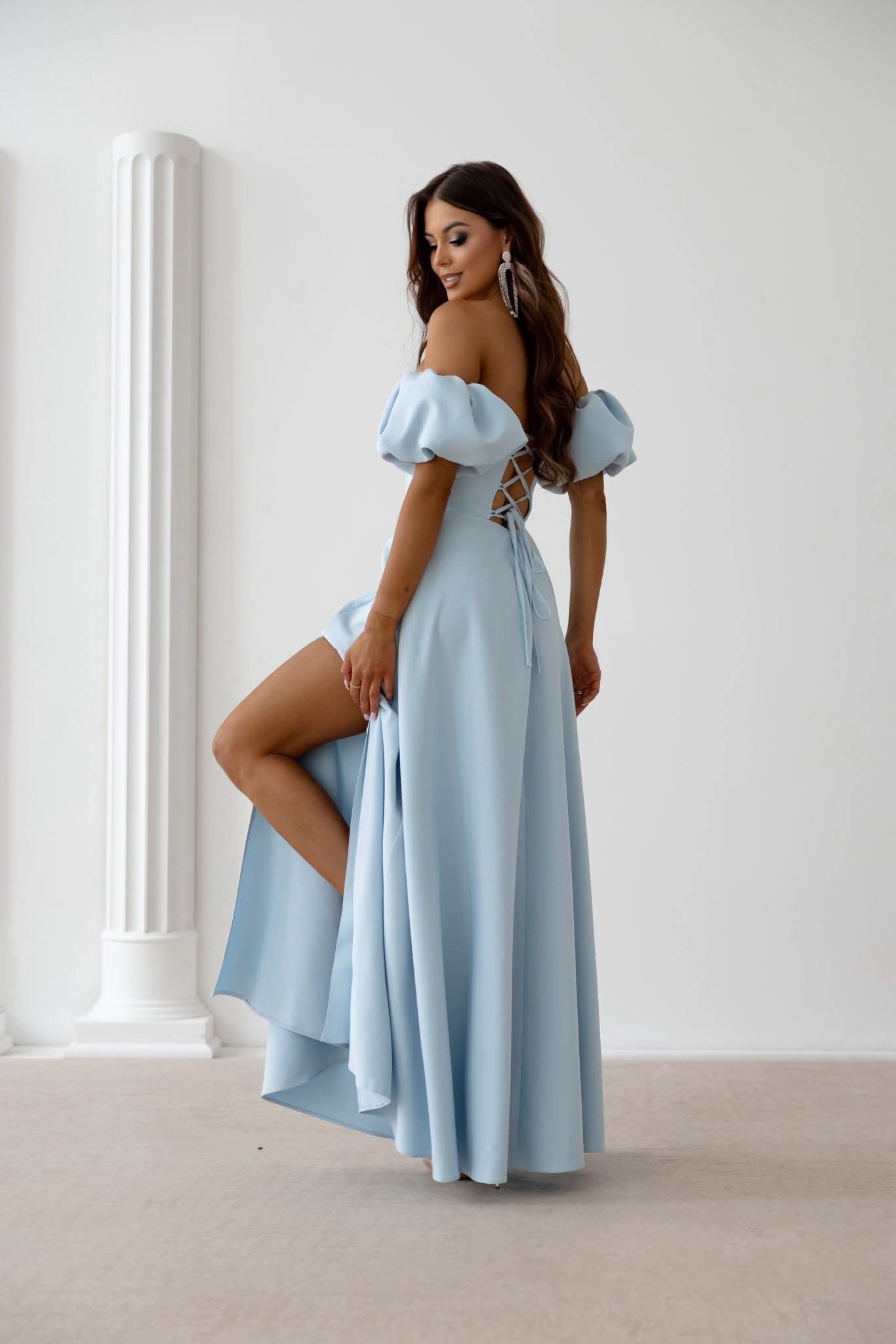 ESMERALDA – suknia gorsetowa maxi w kolorze baby blue z bufkami i różą w komplecie