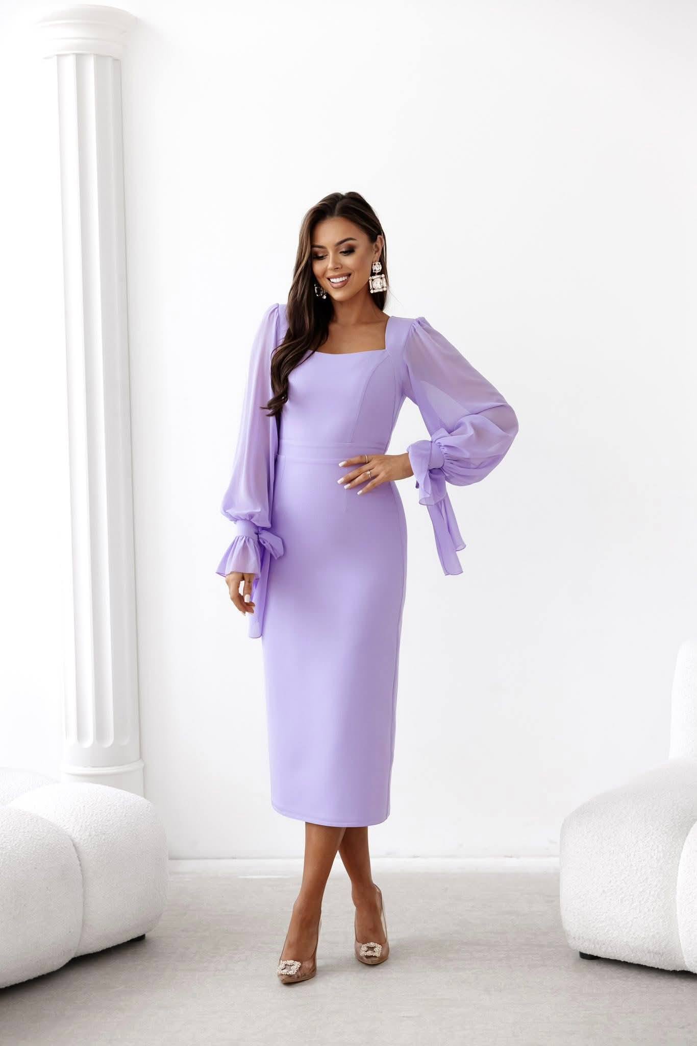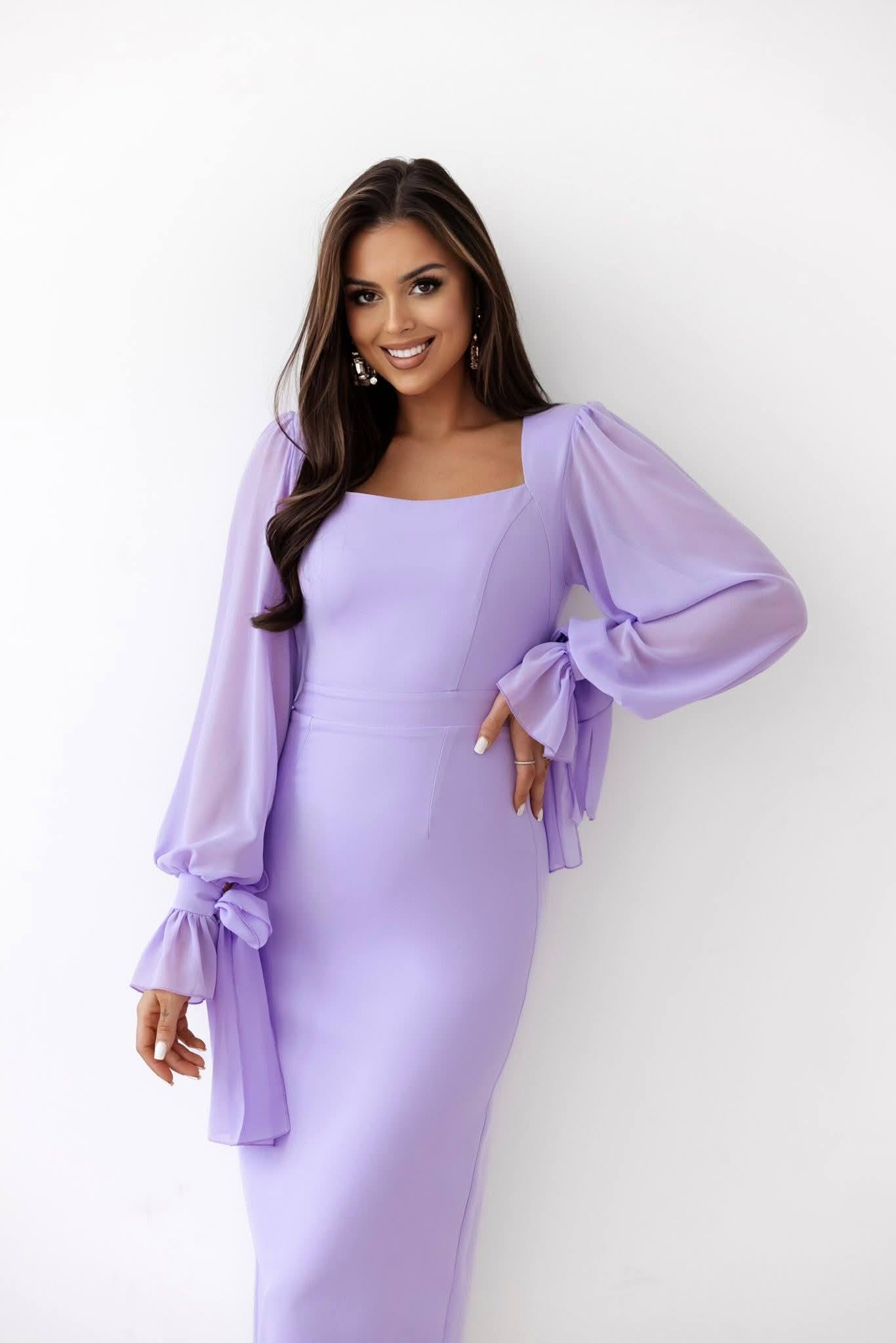 GIANNA – sukienka ołówkowa o długości midi z długim szyfonowym rękawem w kolorze fioletowym