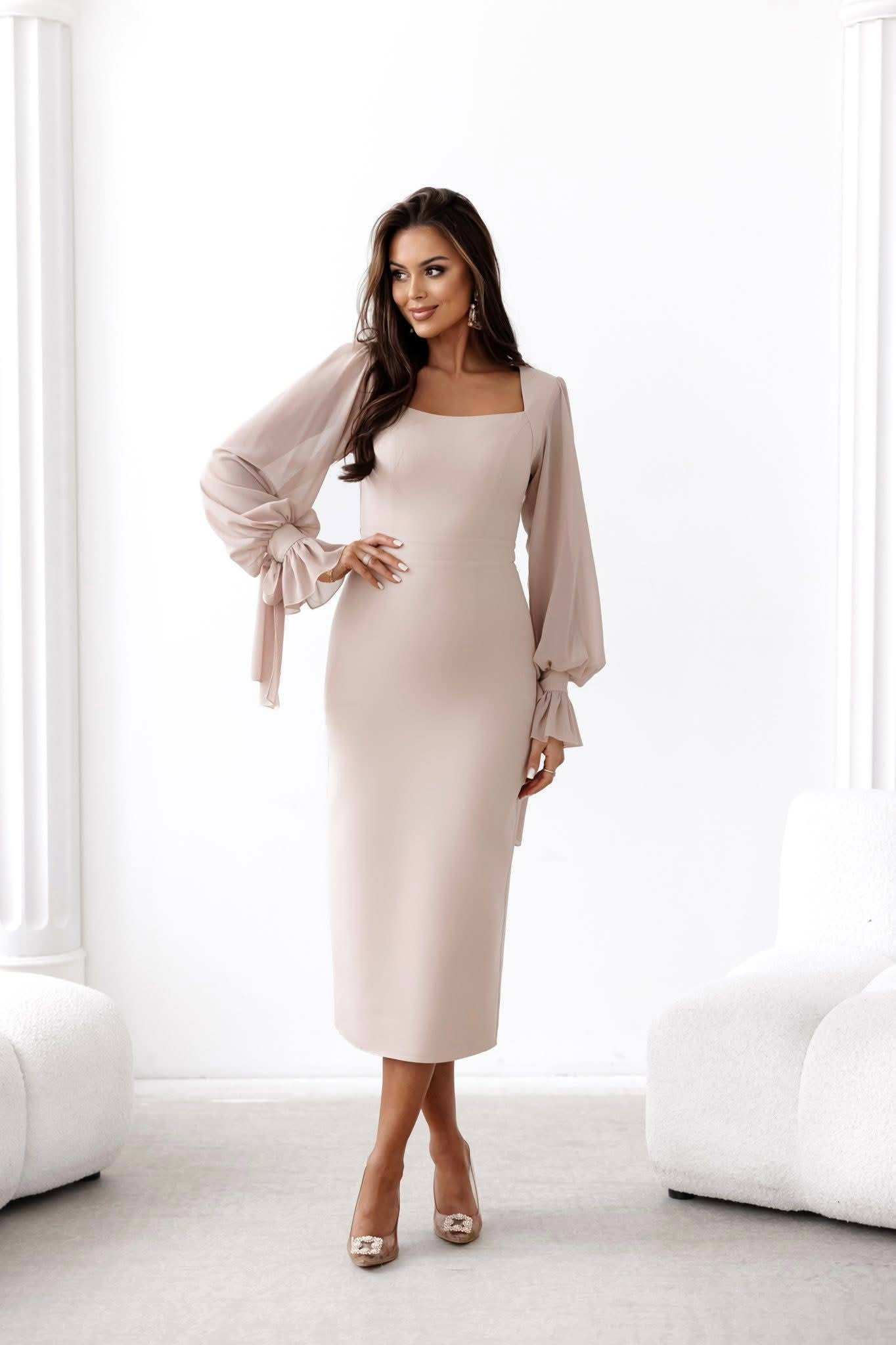 GIANNA – sukienka ołówkowa o długości midi z długim szyfonowym rękawem w kolorze mocca