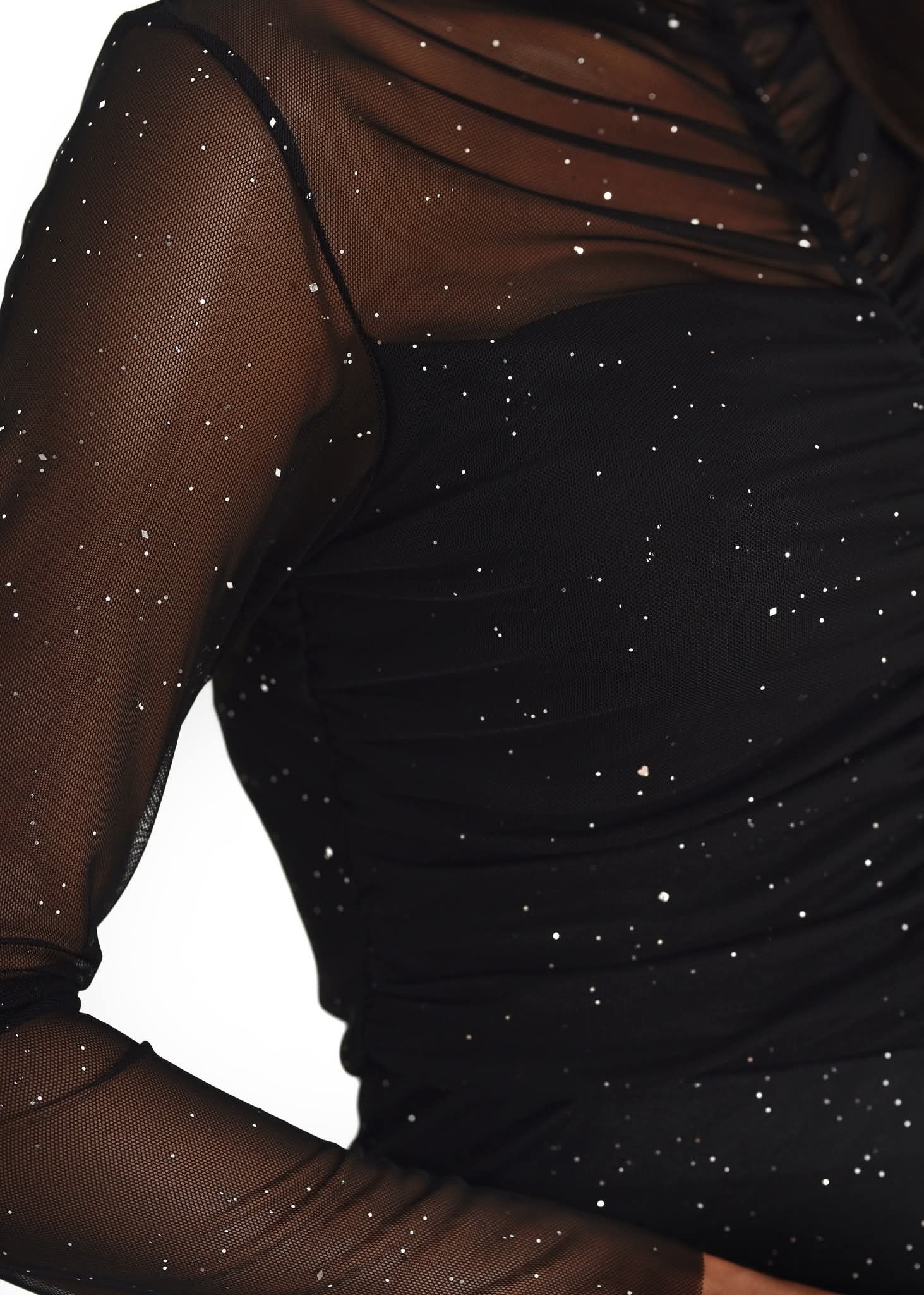 Elastyczna, miła w dotyku siateczka delikatnie otula ciało, podkreślając jego kształty, a błyszczące drobinki subtelnie odbijają światło. Dzięki temu każdy Twój ruch przyciąga spojrzenia. To elegancki komplet damski, który wygląda luksusowo, ale jest niezwykle wygodny – idealny balans między stylem a komfortem. 🌙