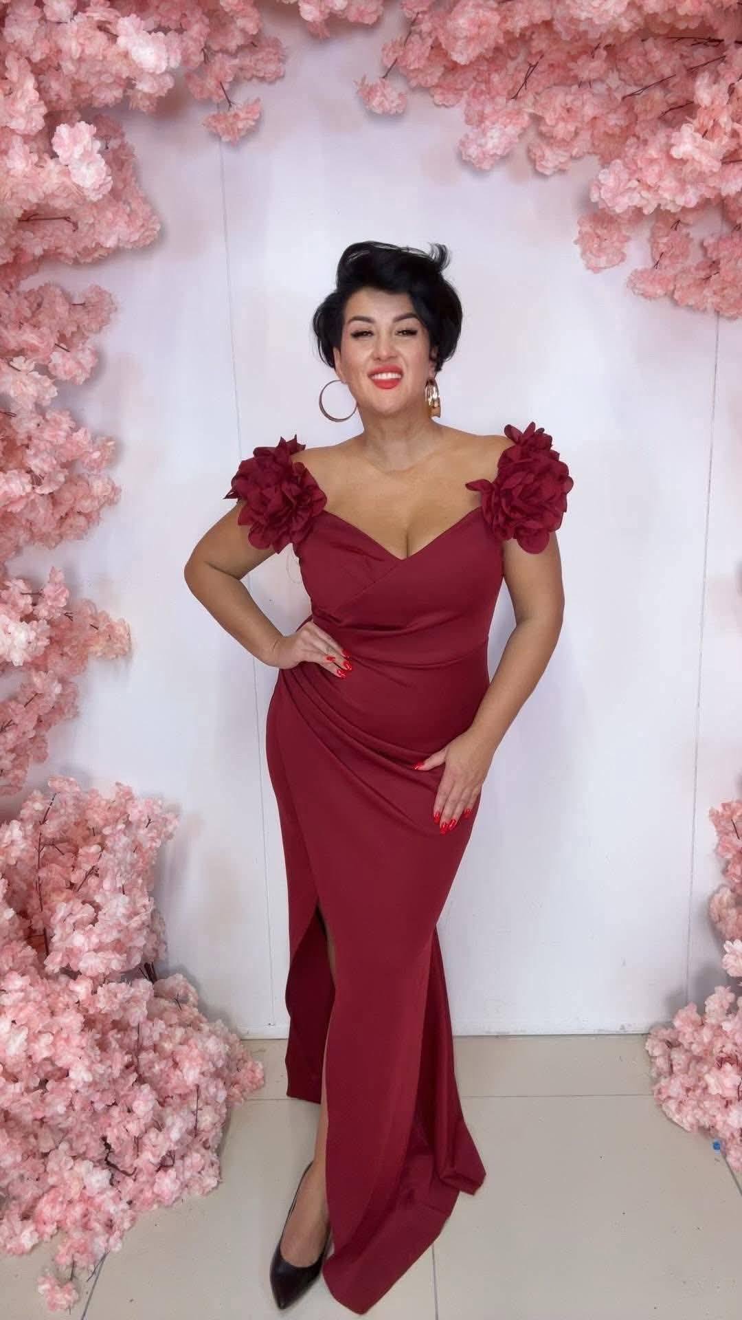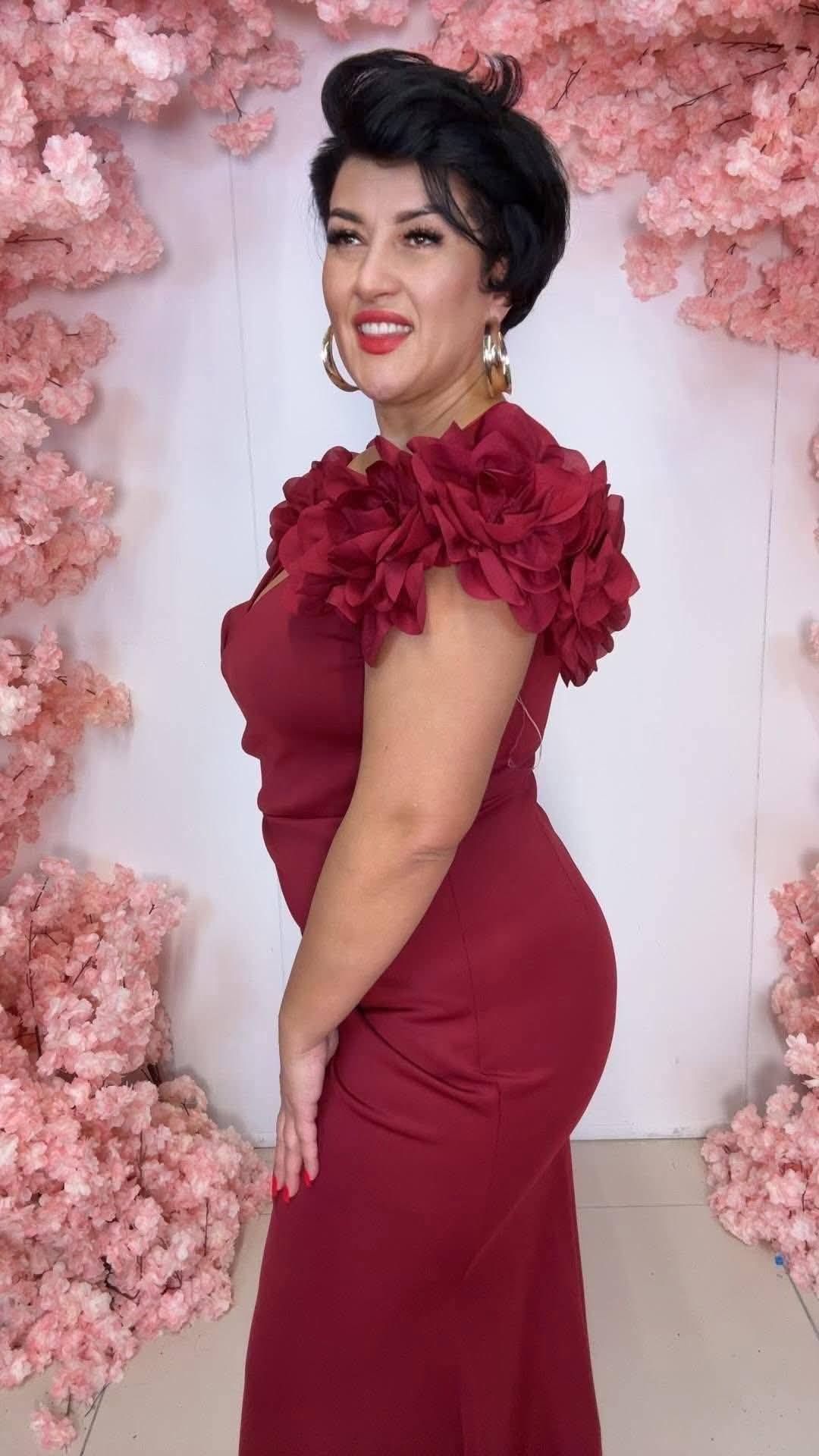 KRYSTIANNA – suknia maxi z efektownymi kwiatami w kolorze bordowym
