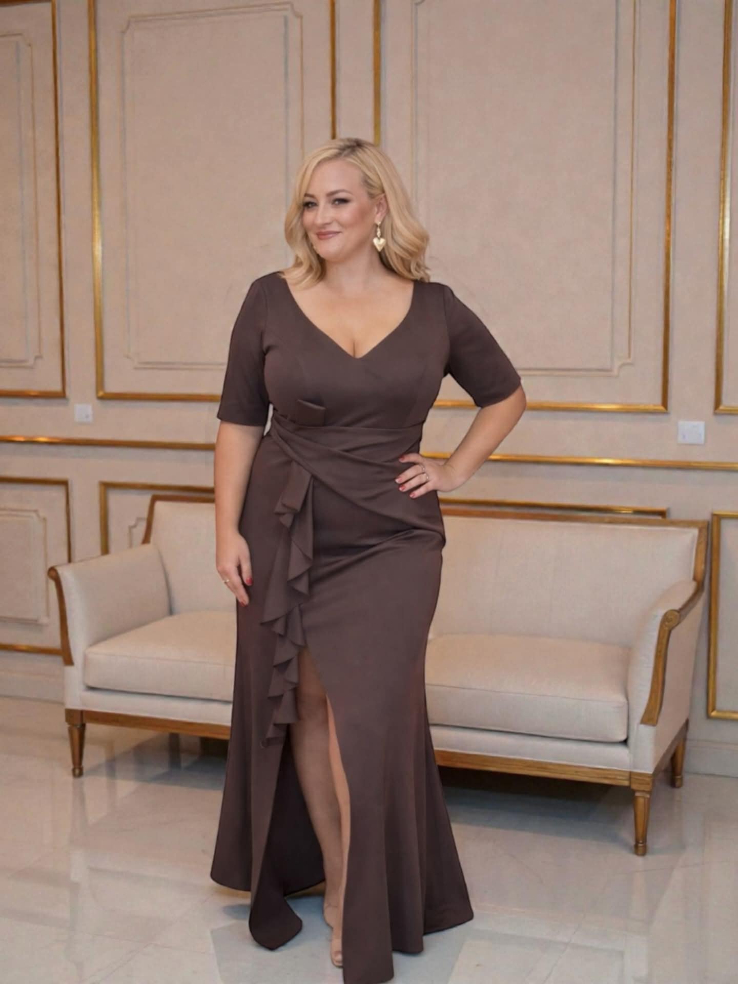 MONIA – sukienka maxi plus size z rękawkiem w kolorze czekoladowym