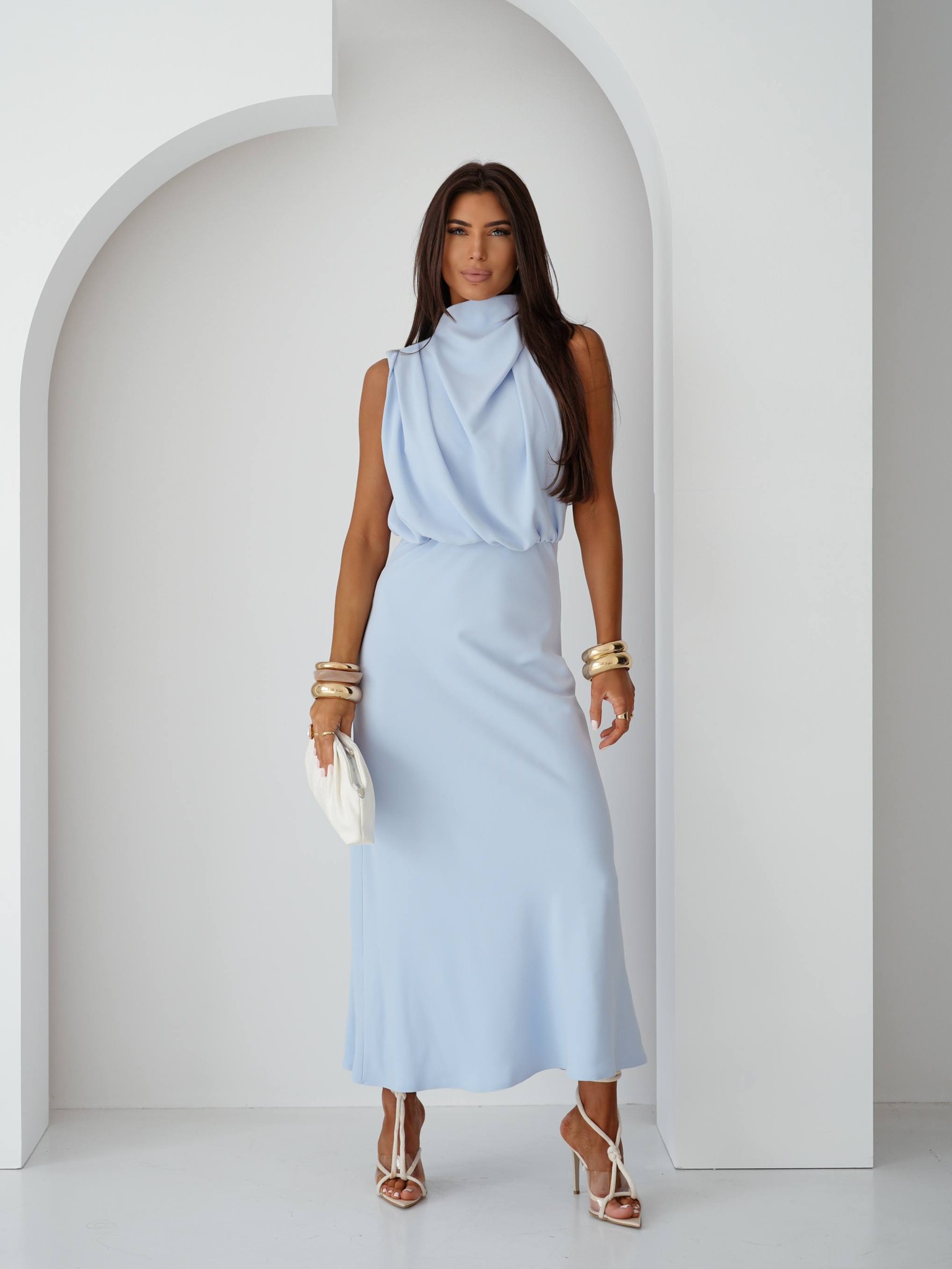 MOON – sukienka o długości maxi z dekoltem typu woda w kolorze błękitnym