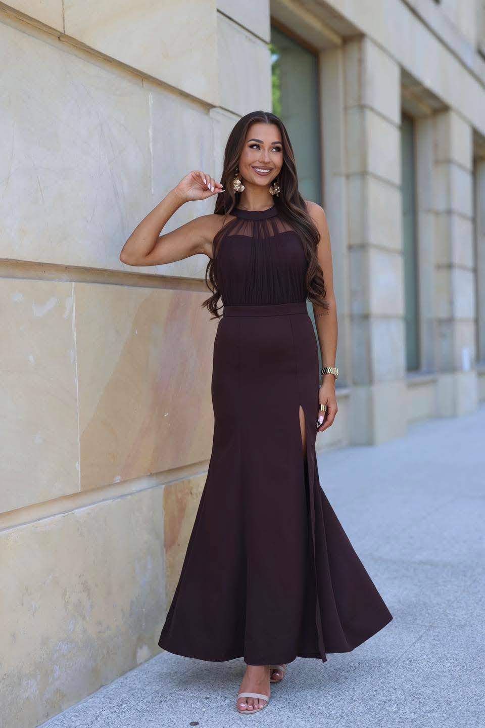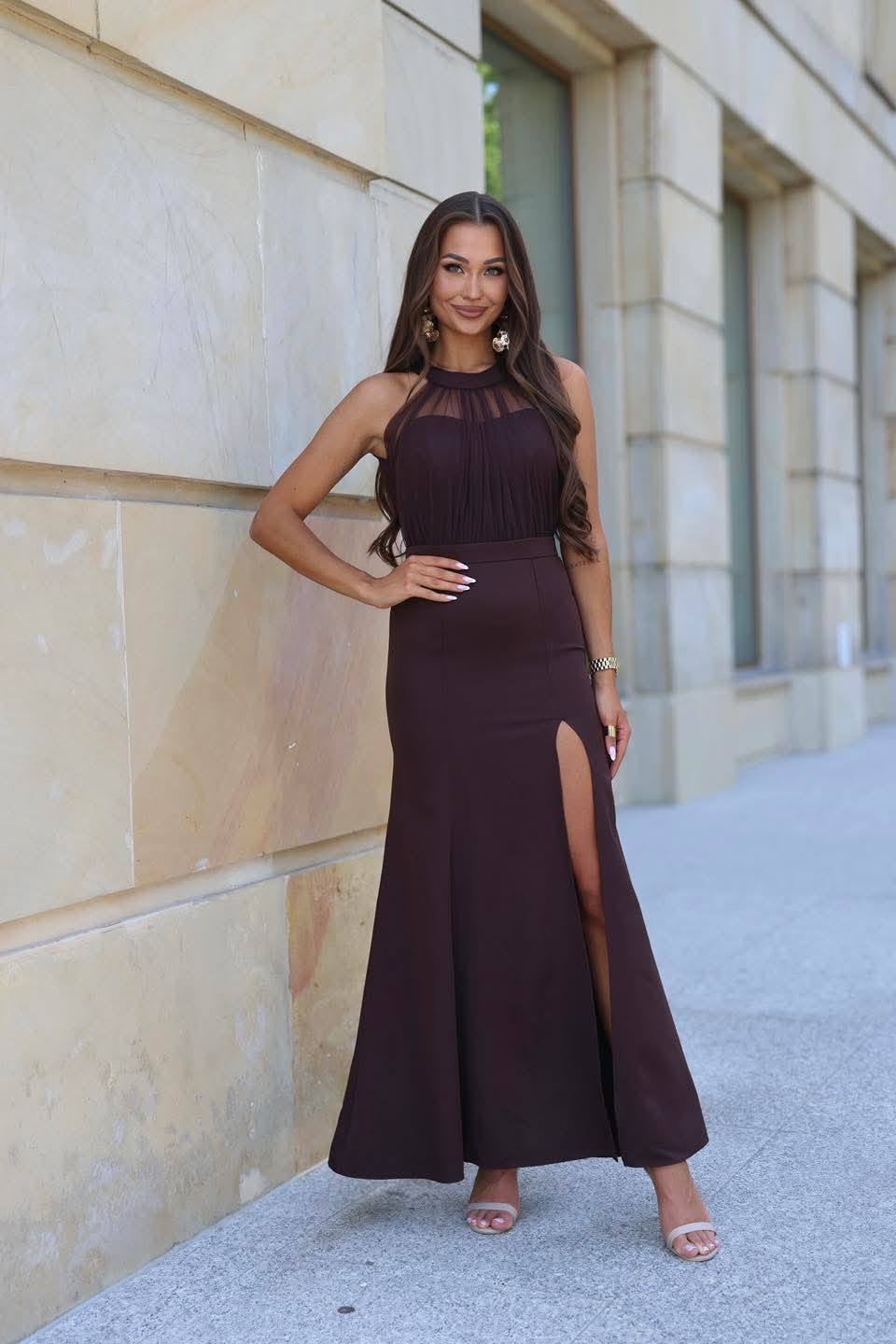 SORAYA – sukienka gorsetowa o długości maxi w kolorze brązowym